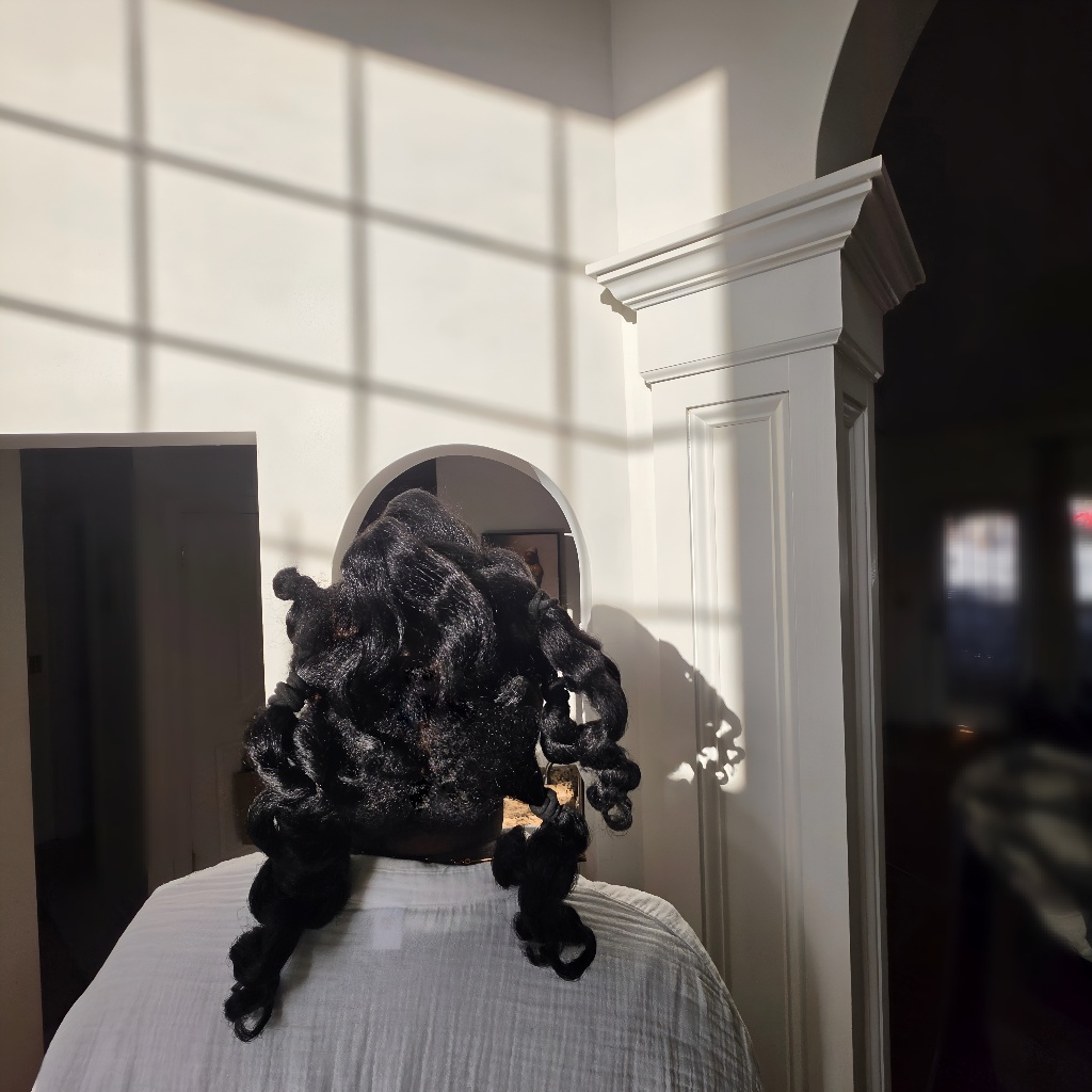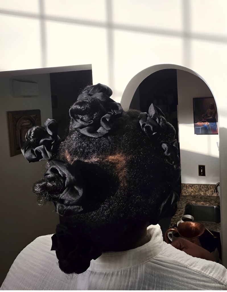 Taking care of fine, high porosity 4a hair often meant rethinking daily habits. Which is why, almost every night I put my hair in mini buns (loose bantu knots to control mechanical tension). By sectioning hair into 3 to 10 manageable knots, you get to choose exactly how much root stretch, tension, and volume your hair needs for the next day. This dedicated block of time serves as a physical reset, and the practice has survived at least a few hundred years (earliest depictions by colonialists of the Bantu people).