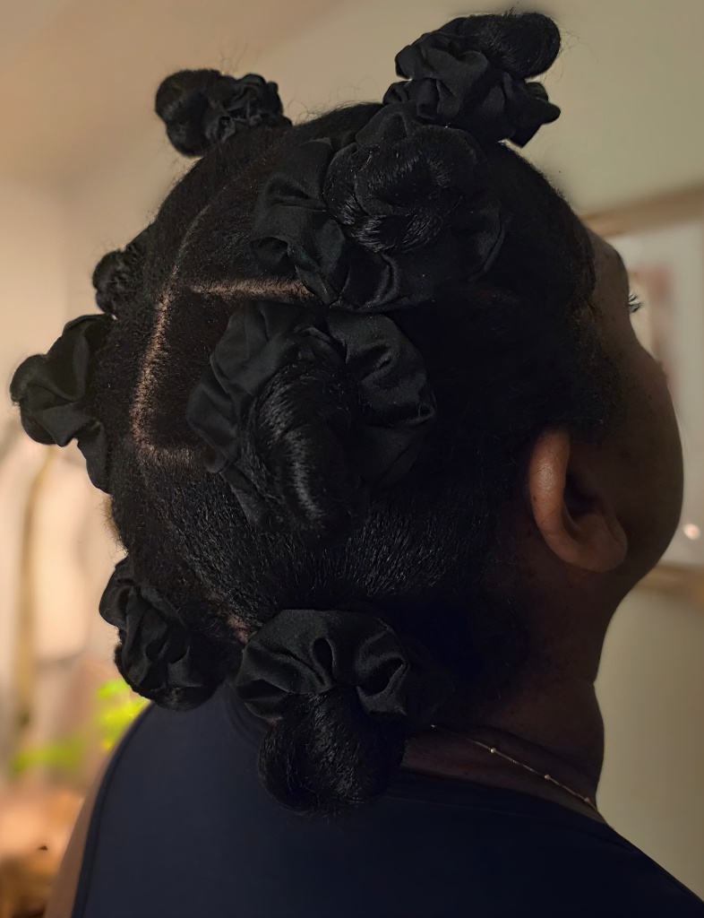 Apply serum to each section and rub it in. Immediately apply a moisturizing lotion, brush gently with a boar bristle brush, and ponytail that section tight into mini buns or bantu knots. I do this about an hour before bed, as pictured here. Once the hair dries, I gently glide the ponytail holder lower by about a half inch. This prevents high tension on the scalp and hair all night long.