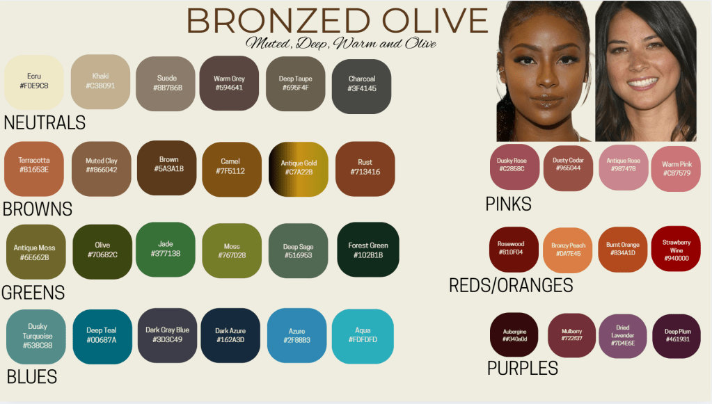 I have always been into color theory as one of my nerdy side hobbies, but the piece of the puzzle actually came from looking at my husband. As a European with dark hair, freckles, and hazle eyes, his coloring is vastly different from mine, yet because men never use makeup, you get an accurate read of his best colors when we shop. Seeing how olive undertones manifest on fair skin (and finding the colors that look best on him) allowed me to finally recognize the exact same olive in myself, I was just slightly warm, muted, and darker, he is cool and more vibrant. Deep implies a saturation I miss, a depth of color. I am brown, but just more desaturated than most. And if you’re wondering if this is about “skin color”, he looks best in the same colors as Lupita Nyongo, and I look best in the same colors as Giselle Bundchen. People focused on color, miss the true picture.